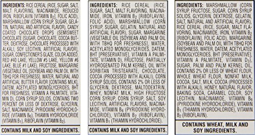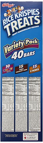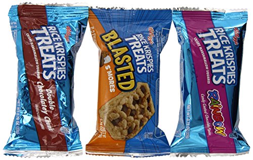 -. Feature : This variety pack includes three delicious flavors: Double Chocolatey Chunk, S'mores, and Rainbow Candy Coated Chocolate. / Rice Krispy Treats are an excellent source of vitamins and minerals. / Kellogg's Rice Krispies Treats Mini Squares fit easily in a backpack, lunchbox, or handbag for a quick snack at any time of the day. / Contains milk and soy ingredients. / This product ships as a 31.2-ounce box.