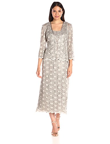 2 piece long dress with/lace jacket lined front closure sequined lace sheath -- updated with an on-trend midi length -- with a coordinating jacket for a polished evening lookFeature