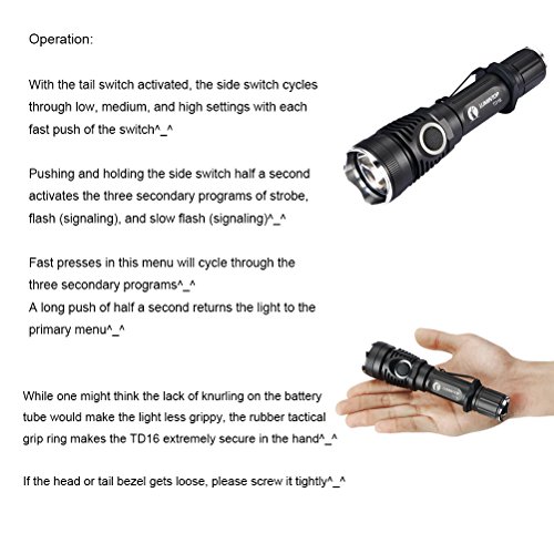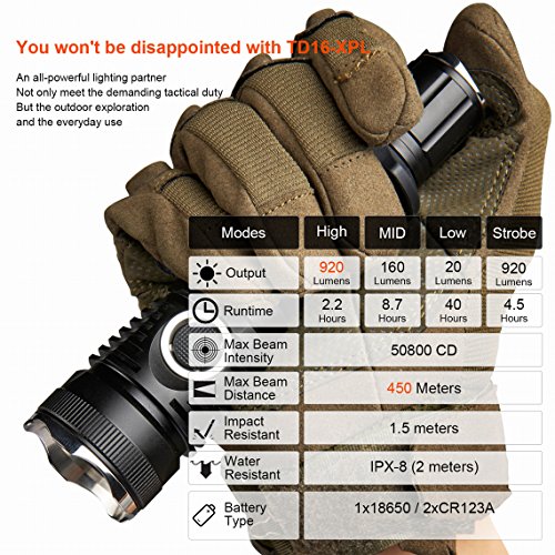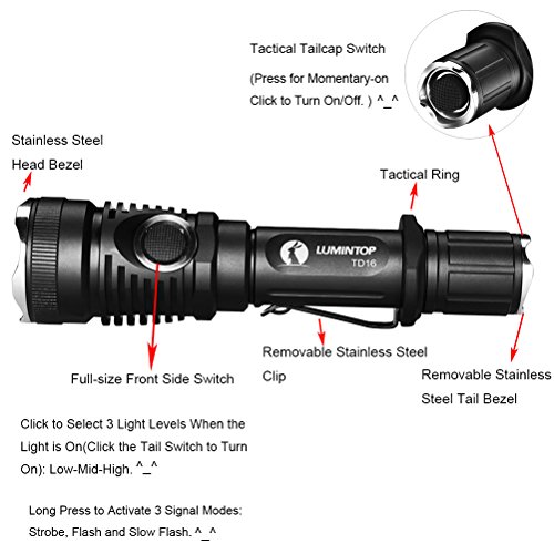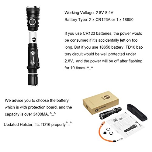 LUMINTOP Circuit Protected TD16 Cree High Power Flashlight+ Rechargeable 18650 Battery 6 Modes Waterproof LED Tactical Flashlight With Strobe + Head Protector+ Holster