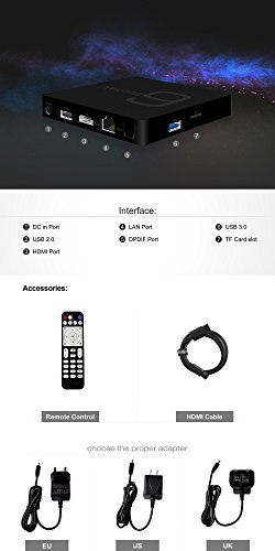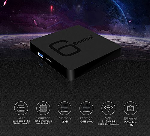 -. Feature : 1000M Gigabit Ethernet, dual-band WiFi 2.4G / 5.8G and Bluetooth 4.1 technology improve the speed and the performance to a large extent. / 2GB RAM + 16GB ROM capacity, gives you more space to download your favorite apps to browse websites, play games, watch movies more smoothly. / Provides the ability to decode video H.265 / HEVC in the format 4K at 60fps or 6K x 4K at 30fps.Be able to cope with the processing of JPEG images with a resolution of up to 65536 x 65536 pixels. / It runs on the Android 7.1, which is good to use. You can connect to a world of content and entertainment at home with the box. / A high performance of quad-core Cortex-A53 CPU can play a wide range of games. HDMI 2.0 is a faster way to send video and audio output to your TV.