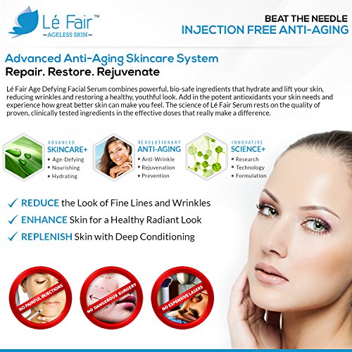 NOT ALL SERUMS ARE CREATED EQUAL. Le Fair Anti-Aging Facial Serum contains clinically proven ingredients in a scientifically formulated serum that delivers! Our non-greasy collagen serum contains skin nurturing ingredients including: Vitamin C, retinol, peptides, aloe vera, and collagen. With regular use you will see a decline in wrinkles and fine lines, a boost to your skin's hydration levels, and much firmer skin. Additional benefits include: