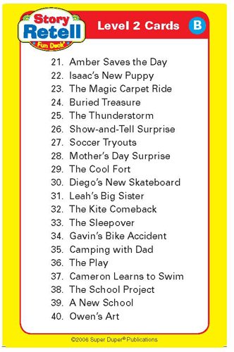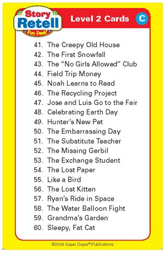 Improve children's listening and reading comprehension skills, as well as their story retelling ability, with these 60 child-appealing stories. Each story has a colorful illustration providing visual cues for children who struggle with story retelling. There are two levels of stories: