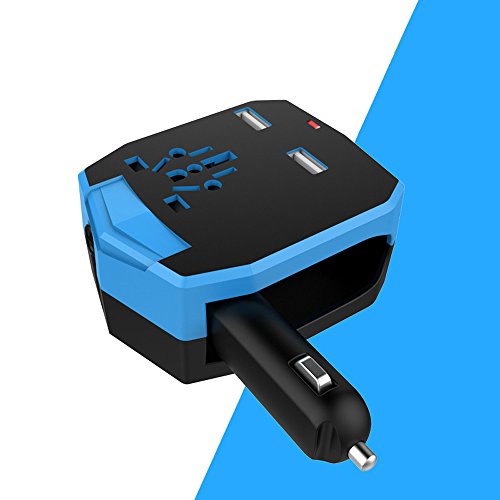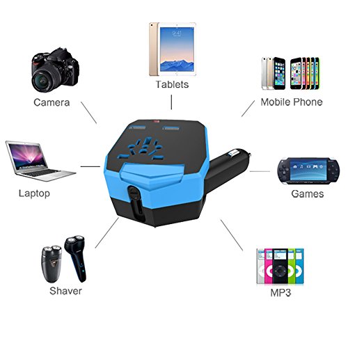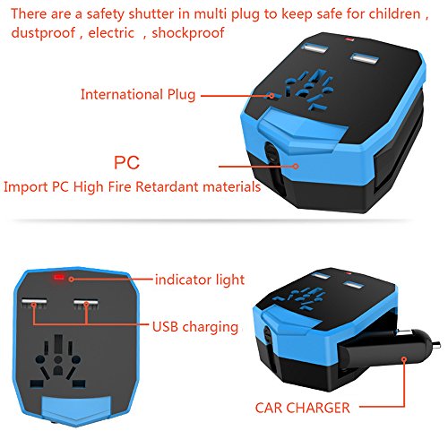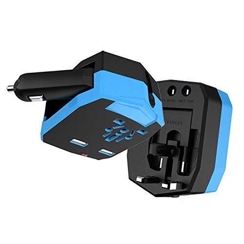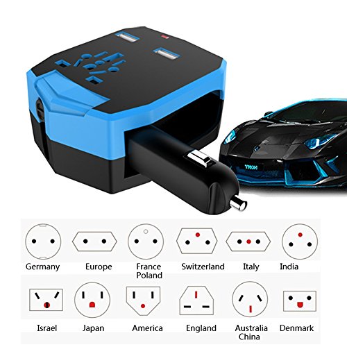 GEREE Worldwide Dual USB Travel Adapter w/ Car Charger Safety Fused Charger for Mobile/Tablet/Camera/Laptop in 150+ Countries , International Plug [US UK EU AU] (Blue car charger)