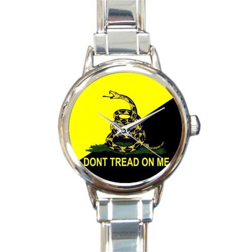-. Binding : Misc. -. Brand : Flag Watch -. Color : Liightgrey -. Department : Mens -. EAN : 6065690632577 -. Feature : 100%stainless steel / The watch band comes with 16 starter links / The watch face measures approximately 7/8". / MIYOTA stainless quartz cassette mechanism and battery / Best Birthday Gift Soft black plastic watch strap and hard plastic watch winder -. Label : Flag Watch -. Manufacturer : Flag Watch -. ProductGroup : Apparel -. ProductTypeName : SPORTING_GOODS -. Publisher : Flag Watch -. Size : 0.75x3.4 -. Studio : Flag Watch -. Title : Personalized Watch Gadsden Flag Don't Tread On Me Round Italian Charm stainless steel Watch