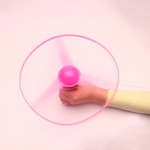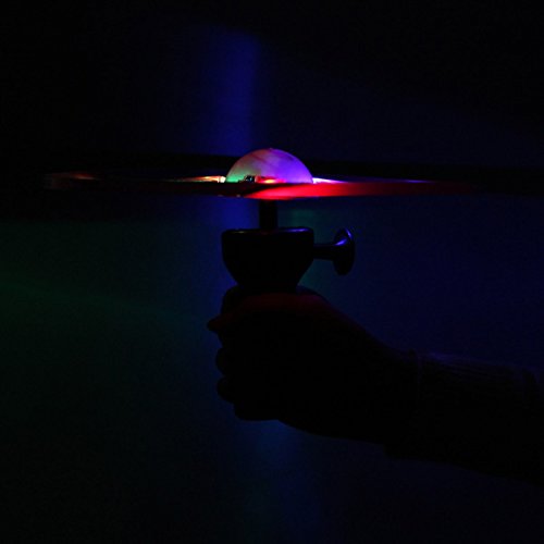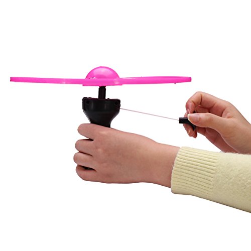 - Operation is particularly simple and flexible, with a switch and three color LED lights.In the process of rising and falling, UFO rapidly rotating and light ,very beautiful. - Open the battery switch on UFO and LED lights. - UFO on the handle, pull the rope, Frisbee will handle silver radiance, very glitzy, high-altitude flying saucer will fly more than 20 meters, attracted the kids cheered! - Pull down the handle can be rotated on the ground, you can use as the gyro, loved by children.