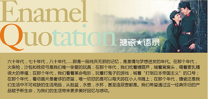 60's, 70's, 80's ...... it was a pure and innocent memories, passion and dreams burst era. At that time, matches guns, sandbags and rubber bow is our only beloved toys; at that time, we were eating candied fruit, gnawing buns, drinking malted milk; at that time, we looked at the revolution movies, playing play devil's game, shouting "do four virtues" slogan; at that time, watching cartoons is extravagant desire, the only good news is that you can squatting comic stalls every day; at that time, enamel or our lives an integral part of daily necessities, from washbasin, water bottles, cups, and even urinals are. We hope that this product gives new life to the classic nostalgia, memories and emotion to bring more of our lives.