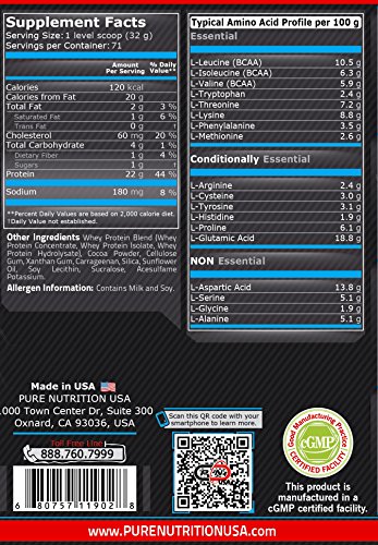 -. Binding : Health and Beauty -. Brand : Pure Nutrition USA -. Feature : ★ LOW CARB LOW FAT NO ASPARTAME - Get those lean muscles you need / ★ MICRO AND ULTRA FILTRATED - Mixes instantly / ★ WHEY PROTEIN HYDROLYSATES - Faster Absorption / ★ OVER 5 GRAMS OF BCAA PER SERVING - Muscle recovery is not an issue here / ★ OVER 4 GRAMS OF GLUTAMINE PER SERVING - Over 61% of skeletal muscle is Glutamine -. IsAdultProduct : 0 -. Label : Pure Nutrition USA -. Manufacturer : Pure Nutrition USA -. MPN : PURE-WHEY -. PackageQuantity : 1 -. PartNumber : PURE-WHEY -. ProductGroup : Health and Beauty -. ProductTypeName : HEALTH_PERSONAL_CARE -. Publisher : Pure Nutrition USA -. Studio : Pure Nutrition USA -. Title : Whey Protein Powder Lean Muscle Micro Ultra Filtrated Mixes Instantly Faster Absorption Over 5g of Glutamine and BCAA 22g of Protein per Serving Low Carb No Aspartam