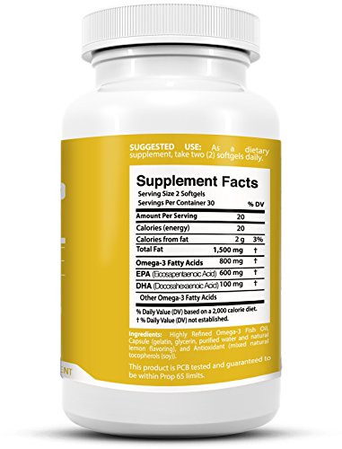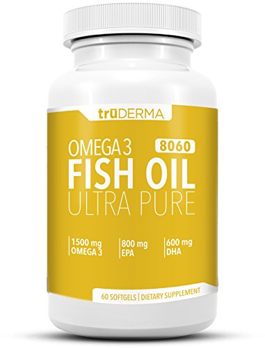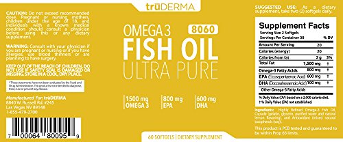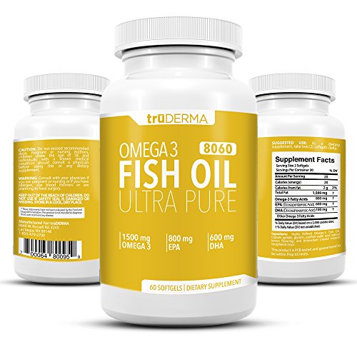 -. Binding : Health and Beauty -. Brand : truDERMA -. EAN : 0700064801000 -. Feature : PURE ESSENTIAL FATTY ACDS truDERMA Fish Oil with 1,500 mg Omega-3 Fatty Acids (600 mg DHA, 800 mg EPA) per serving. Get 3-4 times more Omega-3s compared to other brands. / THIS EXTRA STRENGTH BLEND of Fish Oil supports the health of heart, brain health, joints, mood & mental state, skin & hair. / EASY TO SWALLOW: Our Fish Oil pills are unscented and unflavored and SUSTAINABLY SOURCED from natural deep ocean waters found in nature - NOT from farm-raised fish, and is made in the USA / THIRD PARTY TESTED - Passed PCB Testing For Product Purity, Projected Efficacy, Ingredient Safety, Nutritional Value, and Label Accuracy. Quality you can trust! / 100% SATISFACTION GUARANTEE - truDERMA stands behind its products with a full refund or replacement anytime no questions asked. -. IsAdultProduct : 0 -. Label : truDERMA LLC -. Manufacturer : truDERMA LLC -. ProductGroup : Health and Beauty -. ProductTypeName : HEALTH_PERSONAL_CARE -. Publisher : truDERMA LLC -. Studio : truDERMA LLC -. Title : truDERMA Ultra Pure Omega 3 Fish Oil Pills 1500 mg | Support Healthy Heart, Brain, Joints and Immune System | 800 mg EPA 600 mg DHA | 60 Soft Gels - 30 Day Supply -. UPC : 700064801000