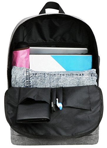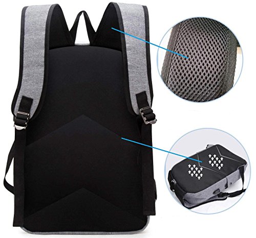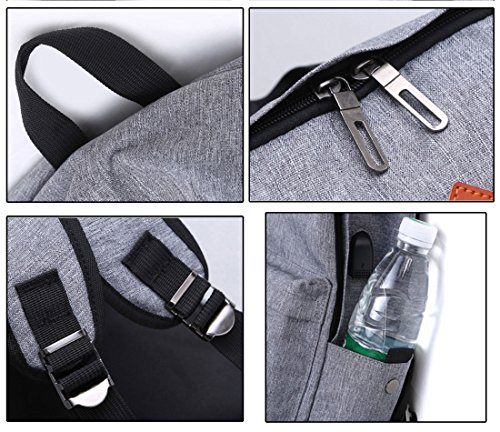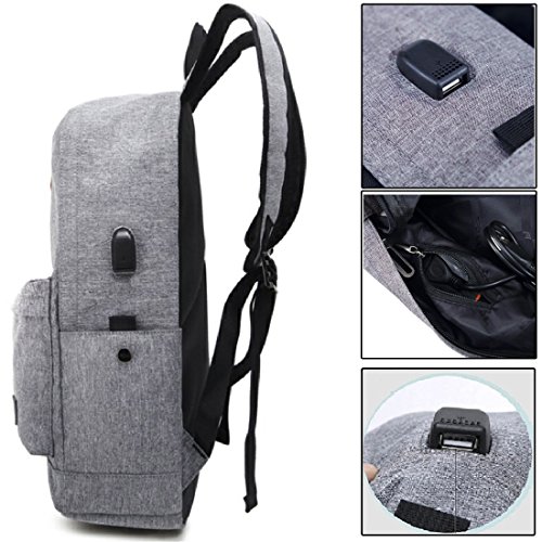1.This canvas backpack is a fashion, durable, lightweight, comfortable and multi-functional casual backpack, made of high quality density polyester with excellent stitching technic which makes it more durable and sturdy.2.Lots of pockets inside to keep things organized and handy. Roomy space for carrying 15.6 inch laptop, books, clothes, water bottles, iPad, phone, pen, keys, wallet and other everyday essentials.3.With a usb port and a removable usb cable, you can charge your electronic device with YOUR OWN portable charger conveniently.4.Padded back panel and adjustable thicken breathable shoulder straps for ultra comfort and stability, suitable for long trips.5.Great daypack for school, college, working, outdoor, traveling, shopping, cycling and everyday use. Bookbags for men women.6.Package Included: 1 x Backpack, 1 x USB cable