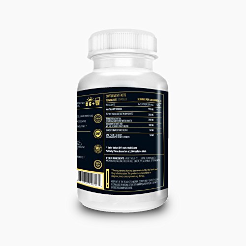 Ingredients Per serving: Nicotinamide Riboside?350 mg, Quercetin (as quercetin dihydrate) 250 mg, Trans-Resveratrol [from Japanese knotweed (root)] 200 mg, Red grape (fruit) and wild blueberry (fruit) blend?100 mg, Gynostemma extract (leaf) 50 mg, Saw Palmetto Berry (standardized berry extract) 50 mg 0 |
