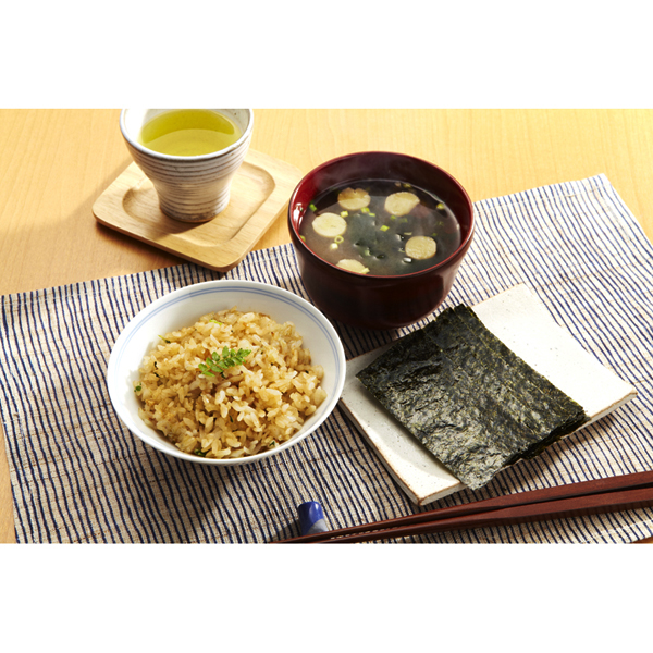 ●口どけのよい海苔に有機丸大豆醤油と天然素材を使った秘伝のたれで調味したコクと旨みのある味付海苔と鶏そぼろに7種類の具材をブレンドした香ばしい醤油味の炊き込み風鶏五目ごはんの素、2種類の米みそをブレンドした合わせみそに、わかめ、麸、ねぎを加えた、まろやかな味わいの味噌汁の詰合せです。