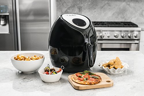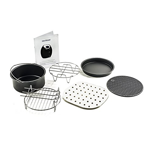 A complete Air Fryer Deluxe Set. Comes with everything you need: 5.8 Quart electric Air Fryer with 1700 watts of power, 50 perforated parchment steaming papers, 8 inch cake carrel, 8 inch pizza pan, Multi-purpose rack with 3 stainless steel skewers, metal holder and rubber mat. In addition, the manual has a starter recipe book, cooking time table and a link to our website where a Demo Video can be seen.Feature