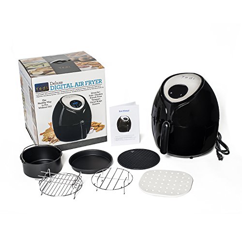 IT'S LIKE A KITCHEN IN A BOX: The Yedi Air Fryer's large 5.8 quart size allows you to cook enough food for the entire family. On the digital touch screen you can set your desired cooking time and temperature. Or select from the built-in smart programs: fries, chops, shrimp, baked goods, chicken, steak and fish. 180°F-400°F of cooking temperature. It's 1700 watts.