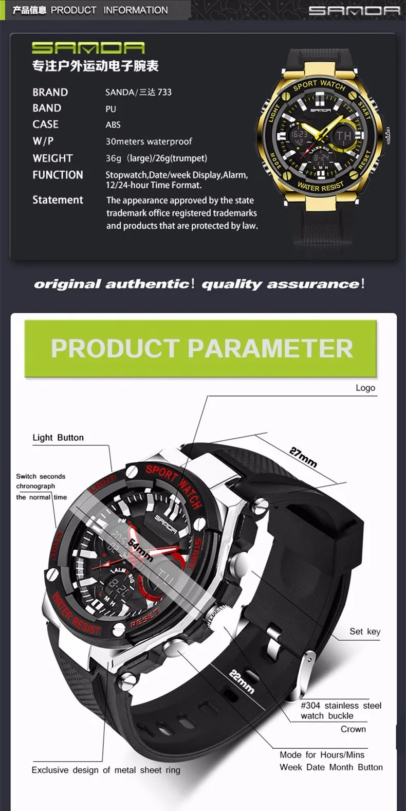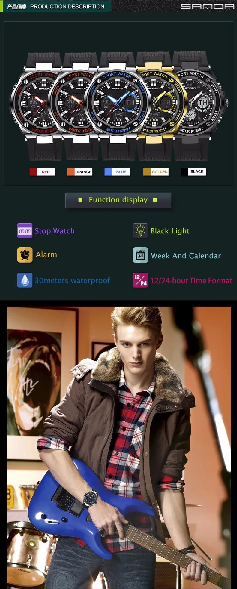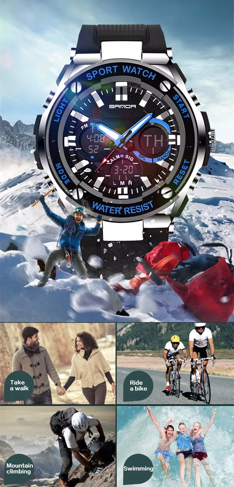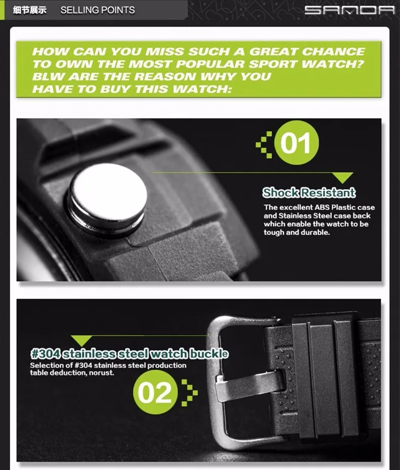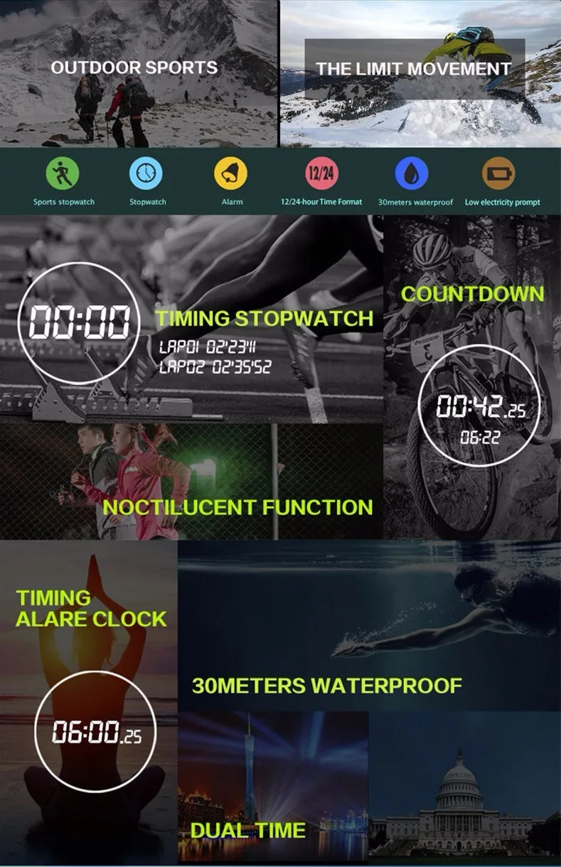 Feature:Alarm,Back Light,Water Resistant,Shock Resistant,Stop Watch,Swim,LED display,Diver