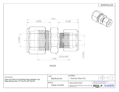 Parker A-Lok 8RU6-316 316 Stainless Steel Compression Tube Fitting, Reducing Union, 1/2" Tube OD x 3/8" Tube OD