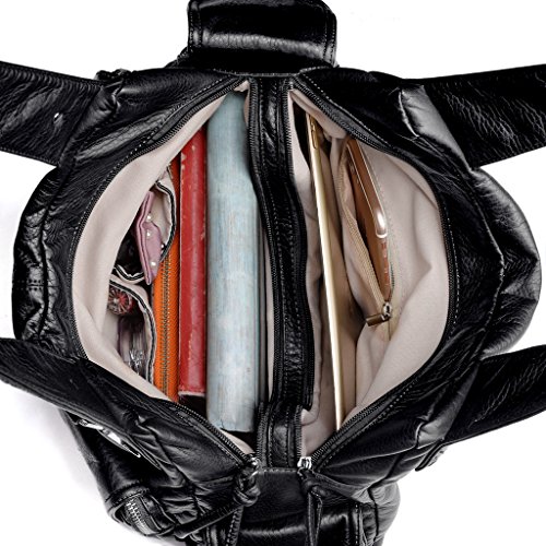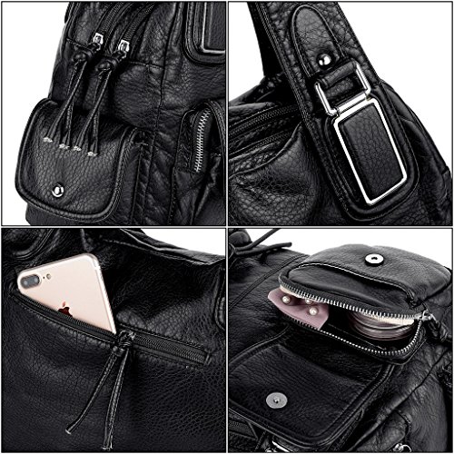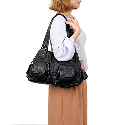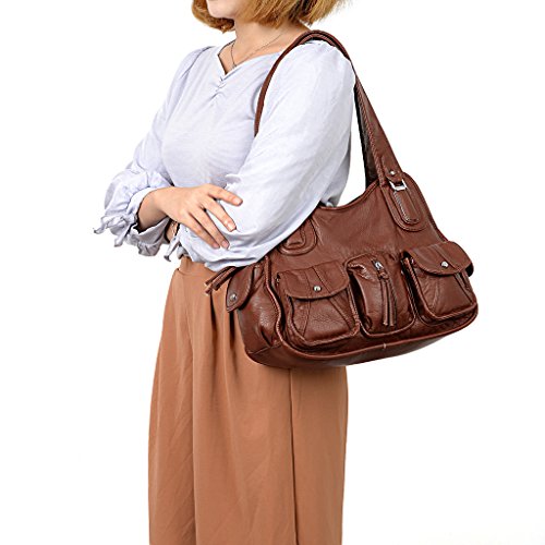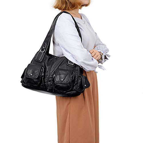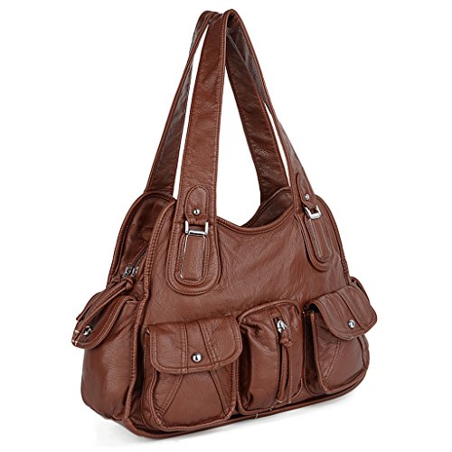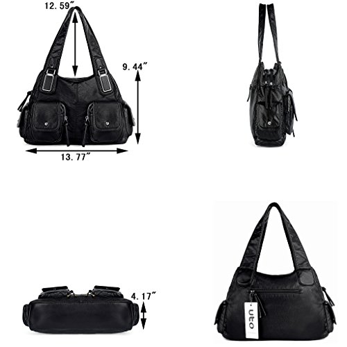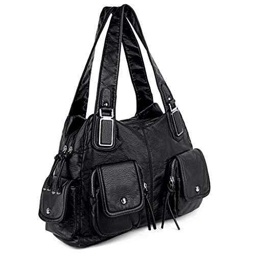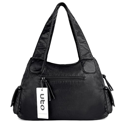 -. Brand : UTO -. Department : womens -. Feature : Ultra soft synthetic vegan leather with fabric lining. / Modern rhodium silver color hardware. Top zipper closure. / Exterior features multi pockets: 2 front magnetic buckle slip pockets and 2 zipper pockets, 1 back zipper pocket and 2 side magnetic buckle pockets. Interior has large compartments with double top zipper closure: Contains 2 open pockets and 1 internal zipper pocket. / Comfortably holds 12.9" iPad Pro / 10.1" Fire HD, tablet or a laptop 12" and under. / Size: 13.77"L x 4.17"W x 9.44"H. Weights: 1.46 pounds. Shoulder straps drops 12.59", which is deep enough to wear on your shoulder comfortably. Lightweight and roomy for everyday use. -. ProductGroup : Shoes -. ProductTypeName : HANDBAG -. Title : UTO Women Handbag PU Leather Front Zippers Washed Shoulder Bag