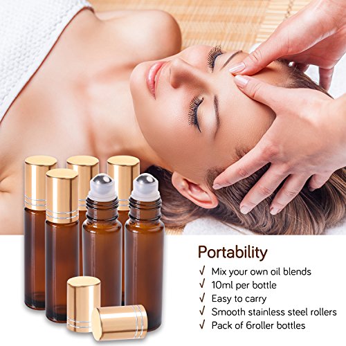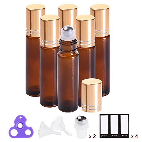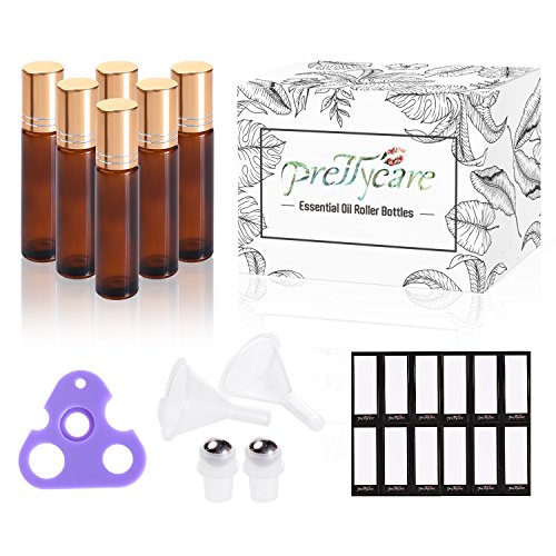 Essential Oil Roller Bottles 10ml ( Amber Glass, 6 Pack, 2 Extra Stainless Steel Balls, 12 Labels, Opener, Funnels by PrettyCare ) Roller Balls for Oils, Roller on Bottles