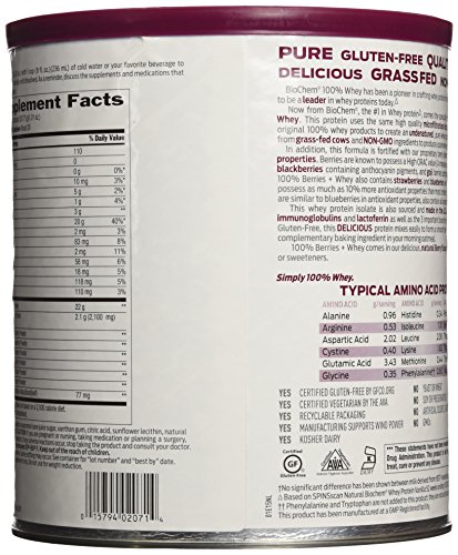 -. Binding : Health and Beauty -. Brand : Bio Chem -. EAN : 0015794020714 -. Feature : Contains the finest quality and most easily assimilated whey protein isolate on the market / The Micro-Filtration method isolates the natural whey proteins in a highly concentrated form without fat / 100% Whey Protein has the lowest molecular weight of any protein -. IsAutographed : 0 -. IsMemorabilia : 0 -. Label : Country Life Vitamins -. Manufacturer : Country Life Vitamins -. Model : 015794020714 -. MPN : 2071 -. NumberOfItems : 1 -. PackageQuantity : 1 -. PartNumber : 2071 -. ProductGroup : Health and Beauty -. ProductTypeName : HEALTH_PERSONAL_CARE -. PublicationDate : 2010-08-02 -. Publisher : Country Life Vitamins -. Size : 1.39 lb (633.8g) -. Studio : Country Life Vitamins -. Title : Biochem 100% Berries and Whey Powder, Berry, 1.3-Pound -. UPC : 015794020714