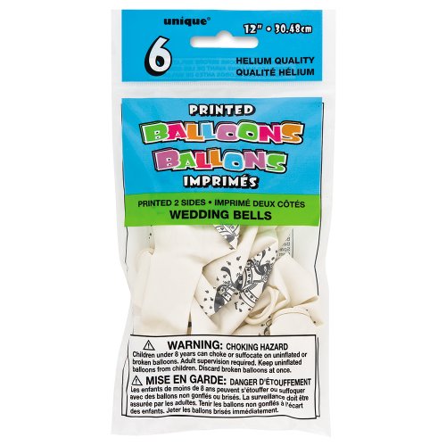 - Feature : Package of 6 White Latex Wedding Bells Balloons / Wedding Bells Latex Balloons measure 12" when inflated (ship uninflated) / Add festive elegance to a wedding, bridal shower, engagement party, or anniversary party / Combine with other balloons to create a balloon bouquet or table centerpiece / Be sure to search for other Wedding Bells supplies and solid color wedding decorations from Unique