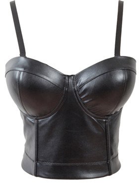 A classic bustier constructed from vegan leather, featuring a built-in demi and adjustable strap, hook and eye closure back.