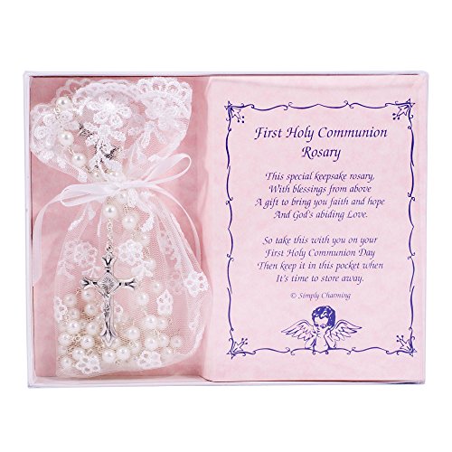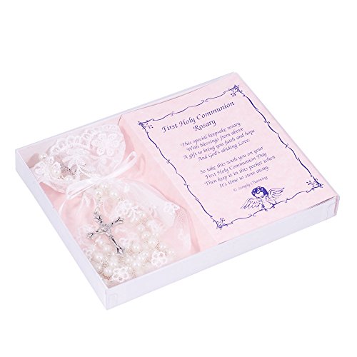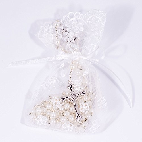 First Holy Communion White Rosary with Lace Keepsake Bag