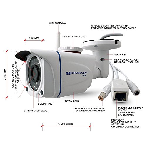 -. Feature : No Subscription, No extra cost and Monthly Fee for viewing live and record videos anytime of the day from anywhere Plus add your camera on microseven.tv to enjoy and share your Live Video with family, friends, and clients - at no additional cost! QR code can be scanned for quick Setup and Intuitive Operation for up and running in a matter of minutes on any iPhone, iPad, Android, PC, Mac / Full 1920 x 1080p resolution at 30 frames per second (FPS) with H.264 Triple Streaming with built-in sensitive microphone and IR cut filter. Ultra-Wide 90 degree viewing angle with 3 Megapixel 3.6mm lens and 2.8 inch SONY CMOS sensor allows maximum light through the lens ─ yielding vivid colors, brighter video and stunning detail with accurate, vibrant colors and provides clear, nighttime video up to 50 feet with superior image detail in even the most challenging low light conditions. / Free Microseven 24 hours cloud storage- Play back recorded motion-triggered video clips from anywhere, with any device, at any time. This Professional camera system also provides a local storage solution with built-in microSD card Slot up to 128GB. Set your camera for continuous recording or recording only when motion events are detected. The saved video can be remotely viewed from any computer or Android or iOS device. Or record and store to FTP NAS & NVR, Blue Iris ,Synology, ASUSTOR and QNAP / Free iOS/Android App, Email, mobile notification for instant push notification on your mobile and simultaneously capture those important events right onto your camera for later review and upload the local storage on micro SD card to FTP, NAS, NVR, like Synology, ASUSTOR and QNAP and Dropbox, Microseven Cloud / (This Model with No Built-in POE) Working over Wi-Fi 802.11 b/g/n. This professional wireless ip camera provide advanced zone detection allows 4 motion alerts zones selected to prevent the false alerts. Wide angle range along with digital zoom provides an incredible, clear field of view. , all metal casing IP66 rating all metal waterproof, night vision. Works over WiFi, Ethernet wired.