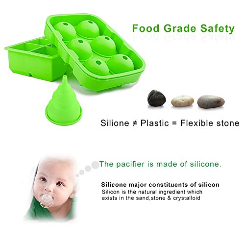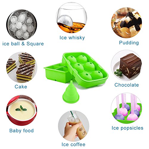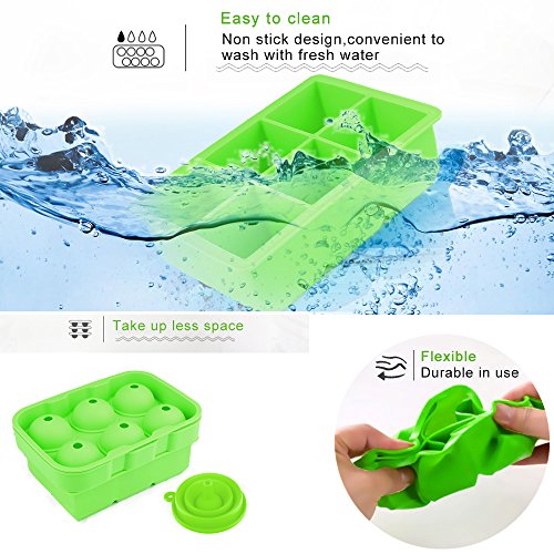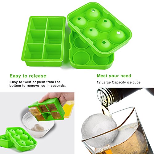 Silicone Ice Cube Trays,Yegu Flexible Novelty Sphere Ice Ball Maker & Large Square Molds with a Funnel for Whiskey Cocktails and Bourbon Keep Drinks Chilled Reusable & BPA Free(Set of 2)-Green