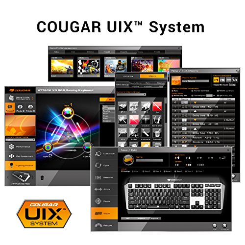 -. Feature : Attack X3 RGB brings you the most popular switches for gaming: Cherry MX switches / RGB Backlight Meets Aluminum: A Glorious Color Performance / N-Key Rollover: Attack X3 RGB frees you from any restriction, allowing you to press any number of keys and obtain always accurate results! / FPS Palm Rest: Gain comfort and improve your performance. / COUGAR UIX software has the most intuitive, friendly, and easiest interface, which allows you to edit unlimited backlight effects. In addition, it offers easier configuration and customization, macro recording and sharing between devices