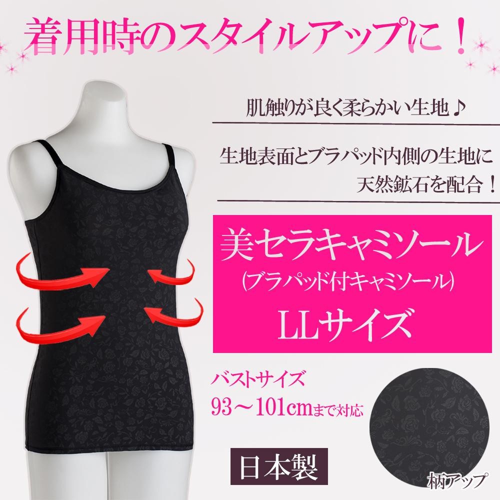 肌触りの良い柔らかい生地で、ブラパッドが内側についたキャミソールです。生地表面とブラパッド内側の生地(バラ柄プリント)に天然鉱石を配合してあります。 |