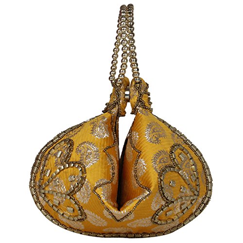 Bangle Potli Bag / Wristlet/ Hand Bag with Brocade Beads - Yellow Color