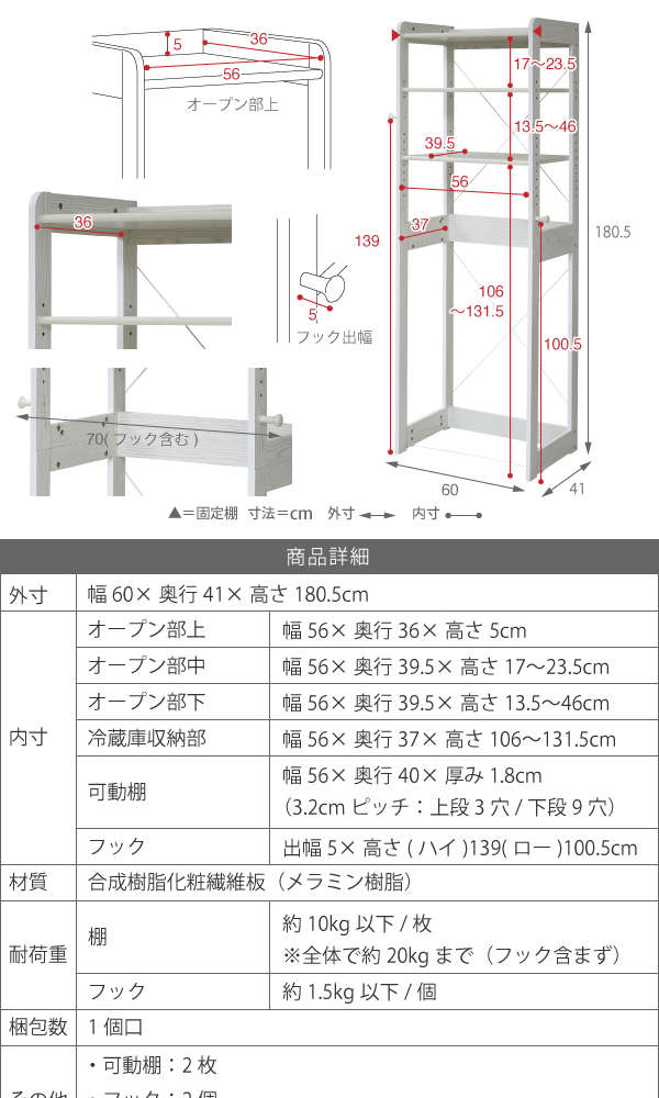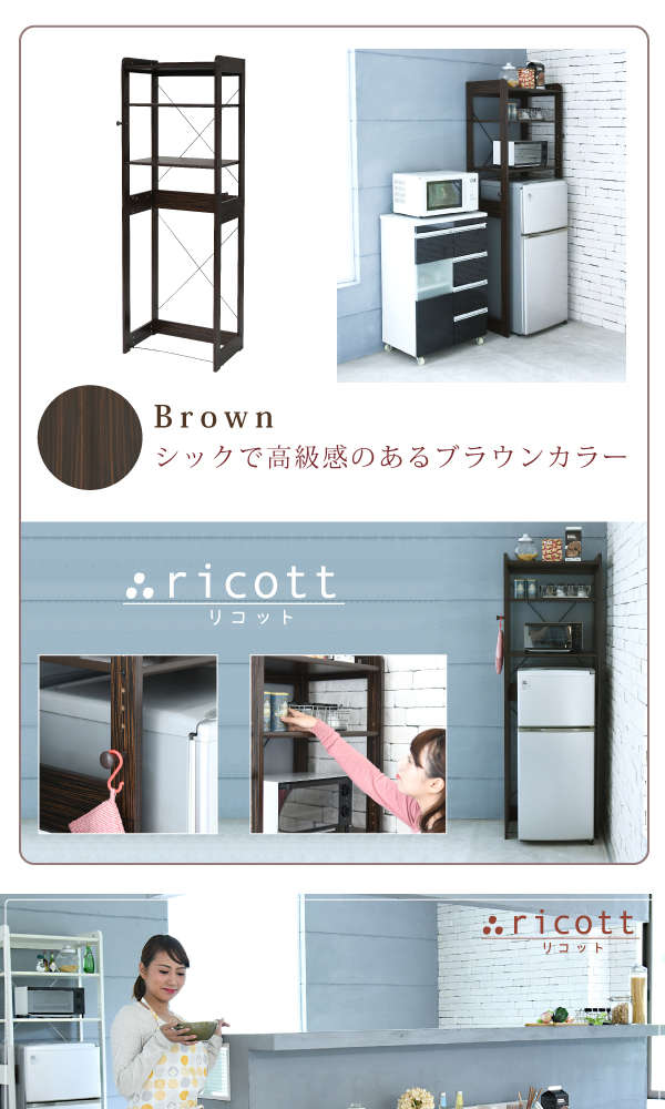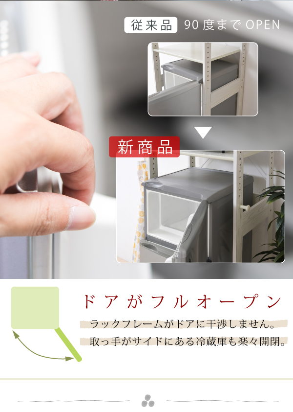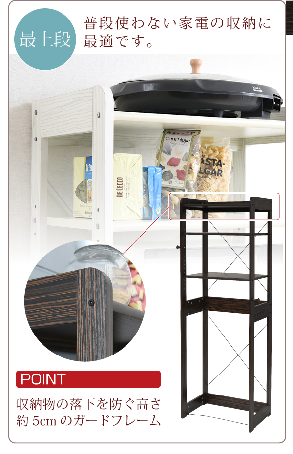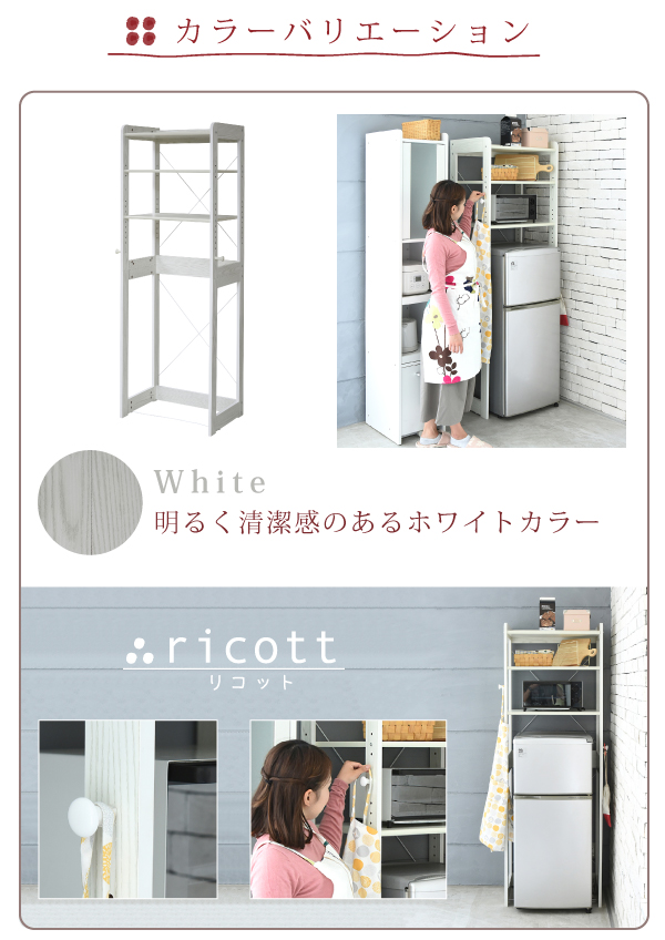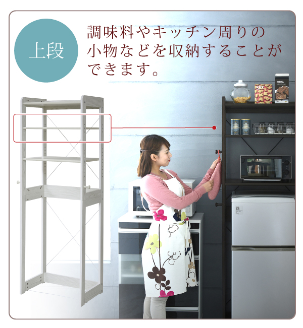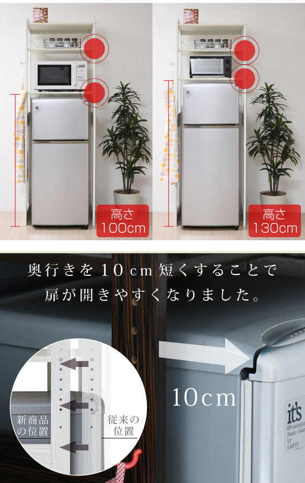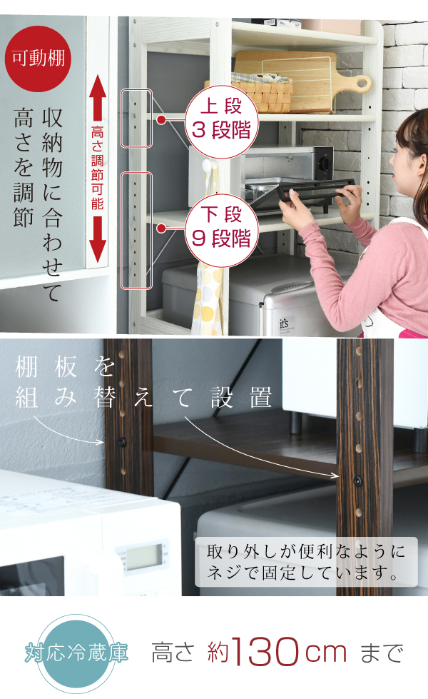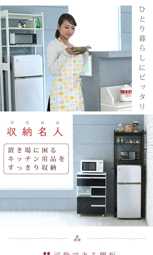 ●上段と下段は可動するので冷蔵庫や電子レンジのサイズに合わせて高さを調節でき、スペースを有効活用することができます