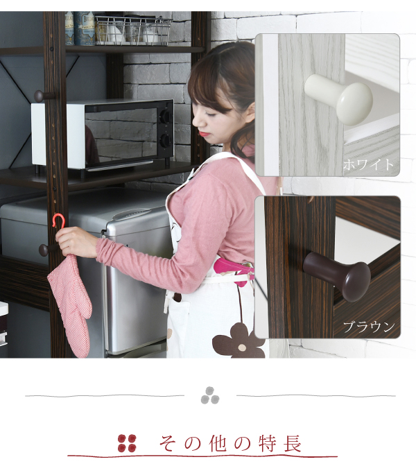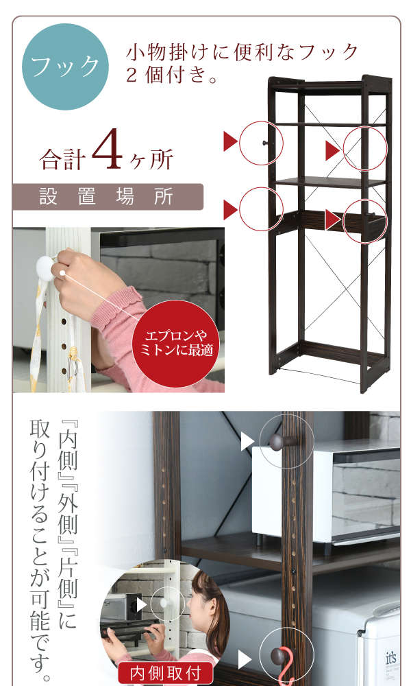 ●フックがついているので、鍋つかみやエプロンなどをひっかけられ、キッチン周りの小物の収納にも活躍します