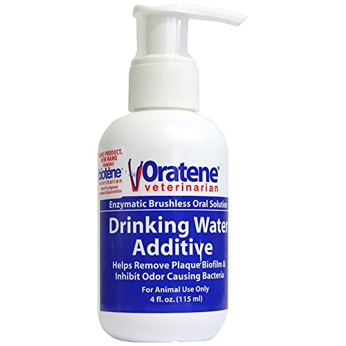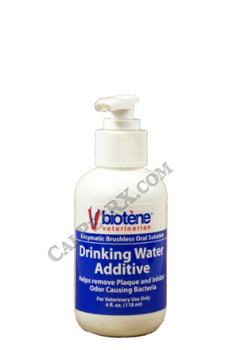 Studio : Biotene Publisher : Biotene Binding : Misc. Product Description Biotene Veterinarian Drinking Water Additive (4 fl oz) contains a patented Mutanase Dextranase enzyme system that affects different glucan bonds in plaque biofilm. Together, they effectively inhibit and reduce plaque formation. By combining these enzymes with our antibacterial enzymes, a comprehensive oral care system is created. This flavorless concentrate is added daily to drinking water to provide the safest, healthiest way to conveniently keep teeth clean without brushing. Does not contain chlorhexidine, chlorine or alcohol Removes plaque while inhibiting odor causing microbes Convenient pump dosaging system Enough for 60 days of water for average size dog 100 safe for daily ingestion; cannot overdose Convenient to insure client compliance Improves oral health pH neutral 0