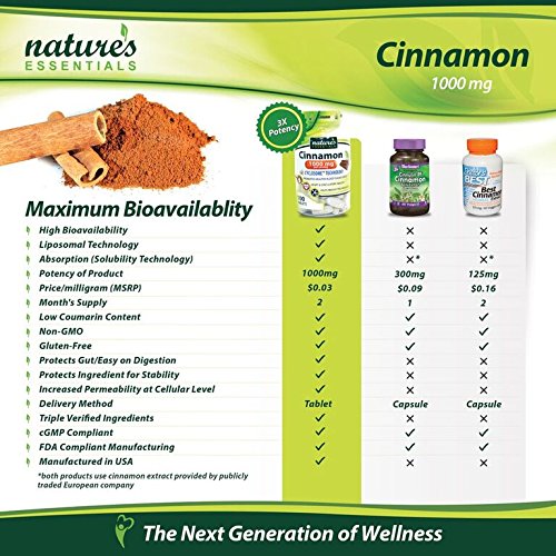 Studio : Nature's Essentials Publisher : Nature's Essentials Binding : Health and Beauty Product Description Nature's Essentials Cinnamon 1000mg 1st of its Kind CYCLOSOME Delivery Technology. Non-GMO, Gluten Free 100 Tablets