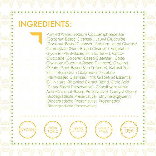 - Feature : SECOND GENERATION FORMULA: Best EWG.org Ingredient Safety Scores (Green Category), #1 Amazon Customer Rated, No Sulfates & Only Natural Preservatives / DEVELOPED BY A TEAM OF DOCTORS: Clinically superior results using gentle, nourishing, pure natural ingredients; CITRUS GROVE: A light, subtle blend of pink grapefruit essential oils and 100% natural botanical extracts / NO ALLERGENS OR IRRITANTS: For all skin types, including those with eczema, cradle cap, and sensitive skin; pH-balanced formula provides mounds of tiny cleaning bubbles, sea salt purifies and balances, while vegetable-based moisturizers retain skin softness / NO HARSH CHEMICALS: No sulfates, triclosan, formaldehyde, parabens, phosphates, SLS, SLES, MEA, DEA, TEA, petroleum-based ingredients, animal by-products, perfumes, dyes or caustics / 100% SATISFACTION GUARANTEED: All natural, non-toxic, hypoallergenic, vegan, gluten-free, biodegradable; Certified Cruelty-Free - Never Tested on Animals; Made in the USA!