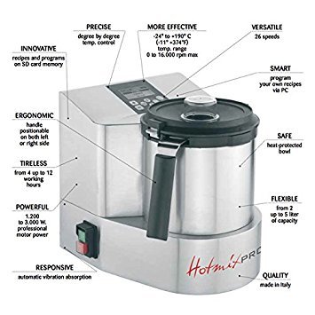 HotmixPRO GastroHotmixPRO Gastro is a food processor with added benefit of heat source. It processes many types of food with precise temperatures up to 190 degrees C (374 degrees F) up to 12500 RPM 78 different programmed functions and 168 classic recipes pre-loaded on the SD card. Whether caramelizing sugar setting custard creams blending sauces cooking jams or kneading doughs HotmixPro's automated processing prepares these recipes without constant attention from the chef.Preparation of complete recipes is convenient and programmed and allows any team member in the kitchen to perform even the most complicated recipes. The result is consistency in high-quality food preparation while increasing efficiency in the kitchen. HotmixPro Gastro is your versatile assistant in the kitchen.Precise: Degree by degree temperature control.More effective:-11 +374 degrees F (-24 to +190 degrees C) temp. range 0 to 16.00 rpm maximum.Smart: Program your own recipes via PC.Safe: Heat-protected bowl.Responsive: Automatic vibration absorption.Powerful: 1200 to 3000 W professional motor power.Tireless: From 4 up to 12 working hours.Ergonomic: Handle on both left or right side.Innovative: Recipes and programs on SD card memory.Feature