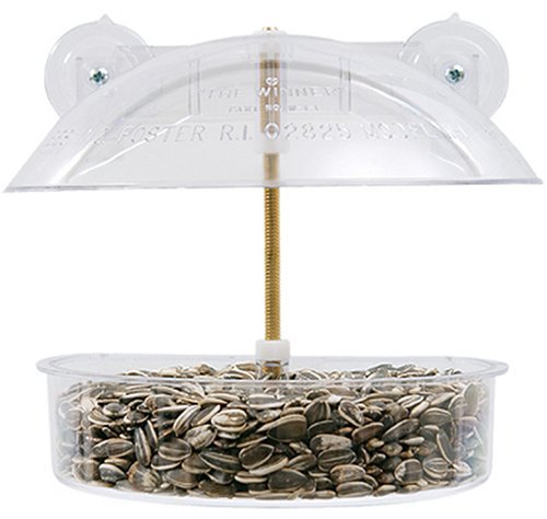 -. Feature : Droll Yankees window feeder offers the opportunity to observe bird behavior and feeding habits from inches away / Use it to distribute up to 1/2 pound of cracked corn, fruit, mealworms, peanut chunks, peanuts in shell, suet, sunflower kernels, or safflower seeds / Feeds bluebirds, cardinals, chickadees, goldfinches, grosbeaks, kinglets, redpolls, siskins, sparrows, thrushes, woodpeckers, wrens, and more / Attaches to window with included suction cups; UV stabilized polycarbonate won't yellow with age / Dome and drainage holes protect seed and birds; Measures 8 by 6-1/4 by 8 inches