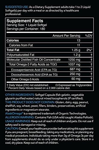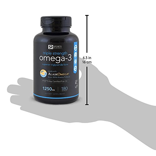 -. Binding : Health and Beauty -. Brand : Sports Research -. EAN : 0023249010500 -. Feature : TRIPLE STRENGTH: Just one softgel contains at least 1037mg of Omega-3 fatty acids from wild-caught Alaska Pollock. Made with AlaskOmega® superior triglyceride fish oil. / PREMIUM: IFOS 5-Star Certified Fish Oil and MSC Certified Sustainable. Molecular Distilled for purity. 3rd party HPLC tested and manufactured in GMP/NSF certified facility. *See IFOS report in the image section. / DOES NOT CONTAIN: Ethyl Ester fish oil, Soy, Gluten, Colors, Beef/Pork Gelatin / BENEFITS: Fish oil may support healthy heart, brain, joints, vision, skin, and vascular health. May also help reduce inflammation and optimize immune function.* / MONEY BACK GUARANTEE: All Sports Research (SR®) products come with a full Money Back Guarantee. Click on the Sports Research Tab above to Try one of our Other Premium Products at No Risk! -. IsAdultProduct : 0 -. Label : Sports Research -. LegalDisclaimer : *The product statements on this page have not been evaluated by the FDA. This product is not intended to diagnose, treat, or cure any disease. -. Manufacturer : Sports Research -. MPN : OM3-180 -. PackageQuantity : 1 -. PartNumber : OM3-180 -. ProductGroup : Health and Beauty -. ProductTypeName : HEALTH_PERSONAL_CARE -. Publisher : Sports Research -. Studio : Sports Research -. Title : Omega-3 Fish Oil 1250mg (Triple Strength) 180 gelcaps| Contains the highest levels of triglyceride Omega-3s EPA & DHA per softgel | Best Omega support for a Healthy Heart - IFOS 5 Star Certified -. UPC : 023249010500