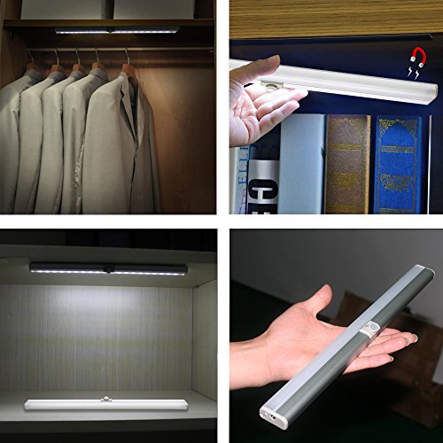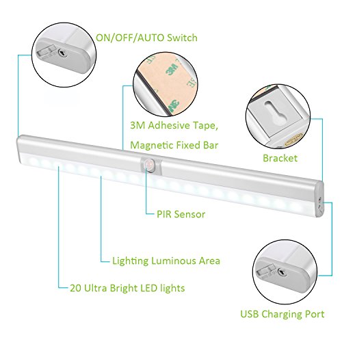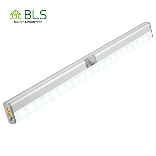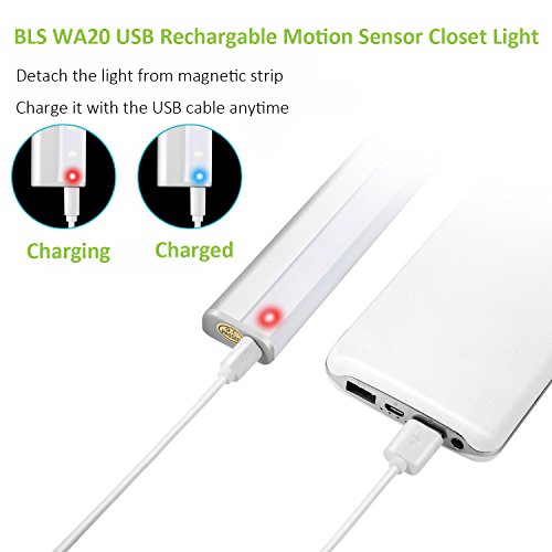BLS WA20 LED Closet Light, 20 LED Super Bright Under Cabinet Lighting, Rechargeable Wireless Motion Sensor Night Light, AUTO ON OFF Switch Safe Lights with Magnetic 3M Strip and Adjustable PIR Sensor