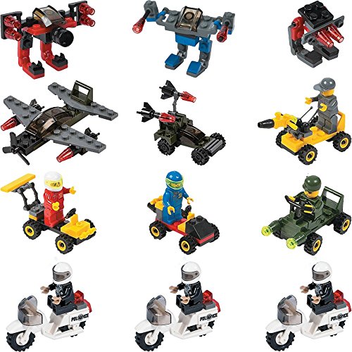 -. Feature : One Dozen (12) Mini Construction Block sets - This is NOT L.E.G.O Brand / Police Motorcycle, Army Planes, Army Jeep, Vehicles, Character Vehicle, Cars, Robots / Great party favors or stocking stuffers Individually packaged ,Each kit contains 20- 35 pcs , / Two levels of building skill levels so the beginner and experienced builder will be equally engaged / Clear Instruction in each Kit