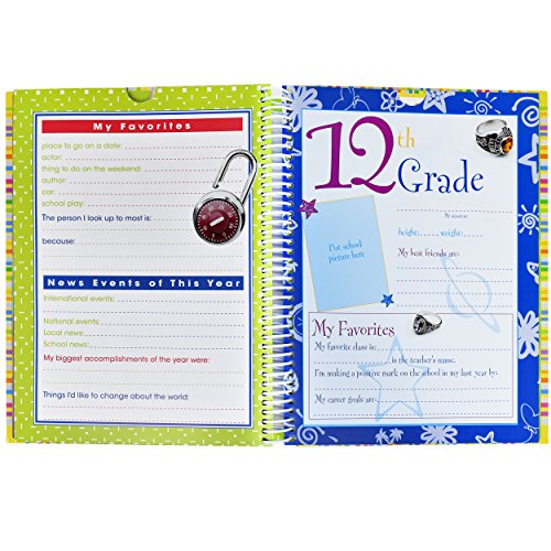 This scrapbook is perfect to capture your child's special school-time memories from preschool to 12th grade. 34 pages - highlighted with colorful illustrations featuring poignant questions and information. Hardcover concealed spiral book measures 10" x 12.25". Printed on acid-free paper to preserve them for years. 14 generously sized pockets for preserving memories. Includes: Preschool, Kindergarten, First Grade, Second, Third, 4th, 5th, 6th, 7th, 8th, 9th, 10th, 11th and 12th Grade! Includes an area in each grade to place that special photo. Bonus: At the end of the book there's 3 sheets for placing up to 12 photos up to 5" x 7" each - ex. School Pictures, Graduation etc.Feature
