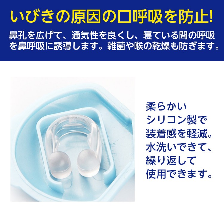 ■こんな方におススメ・イビキがひどいと言われる・周囲の人にイビキで迷惑をかけたくない■イビキの原因睡眠中のに口呼吸になってしまうのがイビキの主な原因です。口呼吸とは…就寝時の口呼吸は気道が狭くなり、イビキの原因となってしまいます。■ノーズピンでイビキ対策point1.鼻の通りがすっきり内側から優しく鼻腔を押し広げ、鼻呼吸をサポートします。驚くほど鼻から大量の空気が流れ込み、肺への酸素吸収率をアップします。point2.繰り返し使える水洗いで何度でも繰り返し使用可能。インナータイプなので肌を痛めることもありません。【商品仕様】製品内容:ノーズピン、収納ケース※注意書き・本品は医療機器ではございません・使用する事でいびきを完治及び完全に防ぐわけではありません。※効果には個人差がありますので、予めご了承下さい。