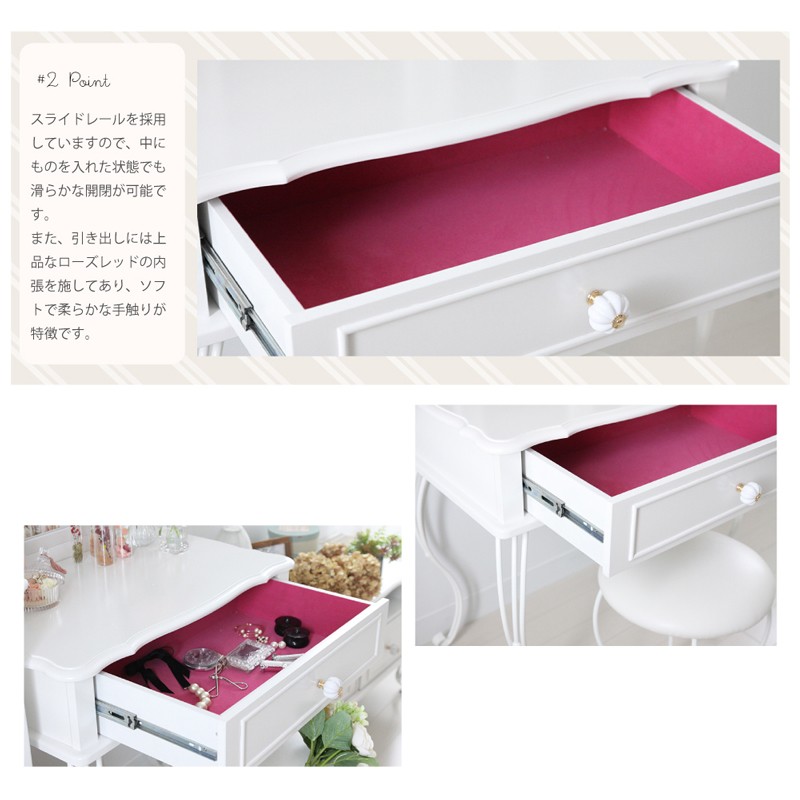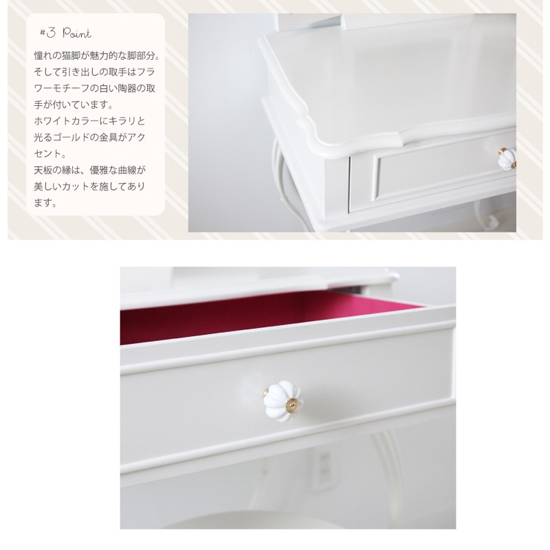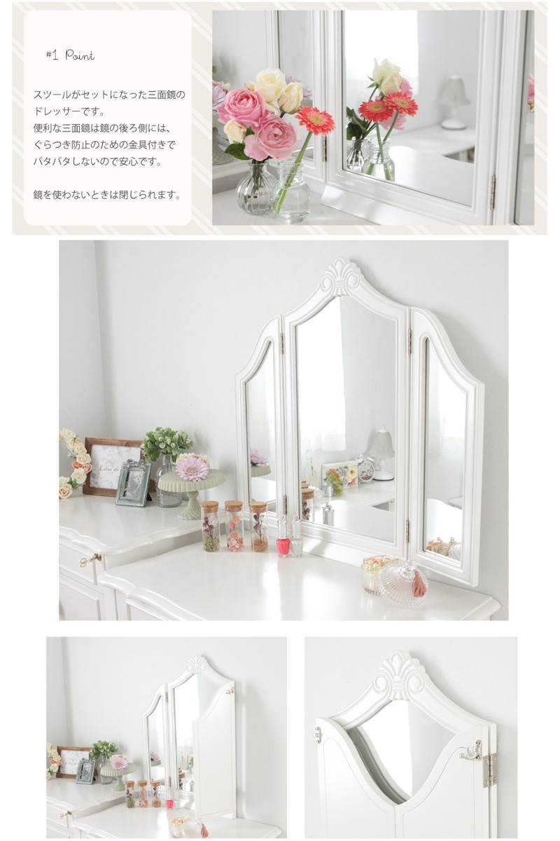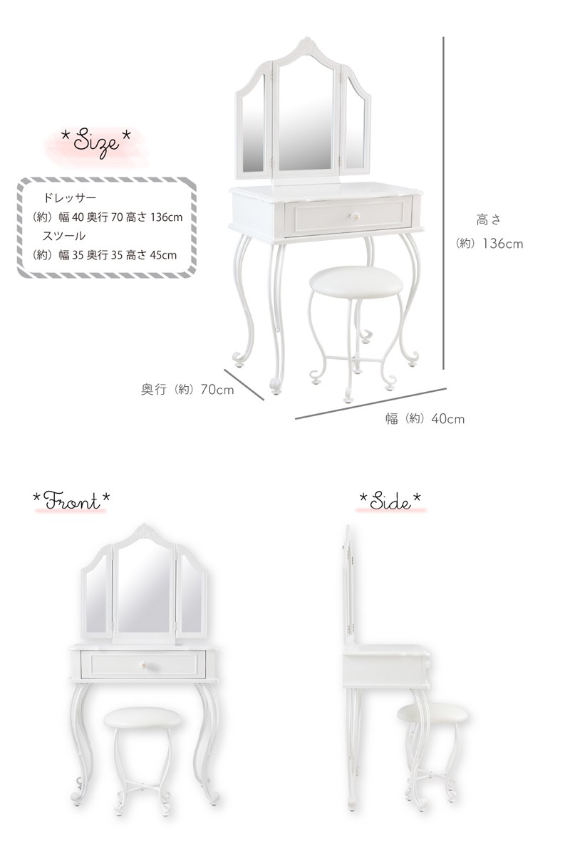 【サイズ(約)】ドレッサー:幅70奥行40高さ136cmスツール:幅35奥行35高さ45cm 【材質】MDF板、 引出内張:綿フランネル スツール:PU 脚:鉄【本体重量】24.9kgお届け仕様:組み立て品※配送時期により、箱が湿気の影響で潰れてしまう場合がございます。※白家具は長期間直射日光に当たるとすこしづつ黄色っぽく変色する事がございます。直射日光を避けてご使用下さいませ。同梱はできません。 別々でご注文お願いいたします。 他商品との同梱ご注文の場合、送料の一部をご負担いただく場合がございます。ご了承くださいませ。