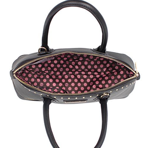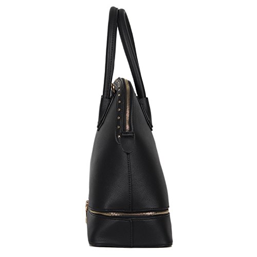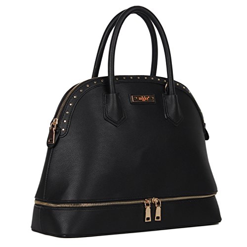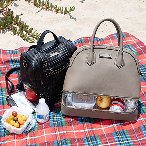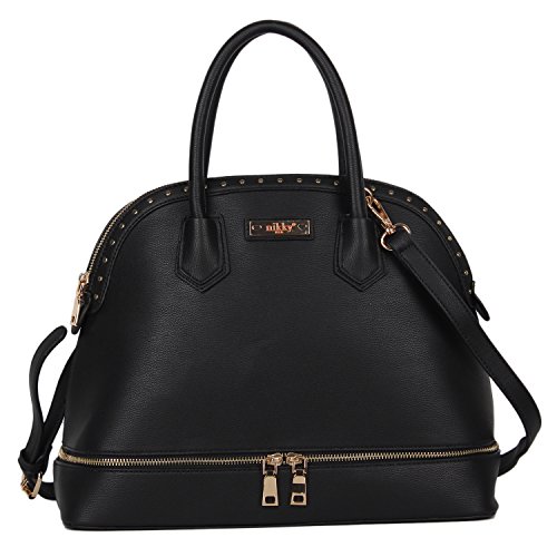 Studio : Nicole Lee Publisher : Nicole Lee Binding : Apparel Product Description Feel stylish and prepared with this 2-in-1 Nikky Sidra dome bag that doubles as a lunch bag. Exterior Features: Made of high quality eco-leather. Zipper closure for main and bottom compartment. Tarnish free studded hardware. Includes signature Nikky logo nameplate. Flat base for structure. Dual eco-leather handles with a 4.4" drop. Optional, adjustable strap extending 40"-45". Interior Features: One large main compartment with zip and slip pockets. Lined with the signature nylon Nikky polka dot print. Insulated bottom compartment for food storage, Includes a food container that fits perfectly in the bottom compartment. For cleaning, wipe with damp cloth. 0