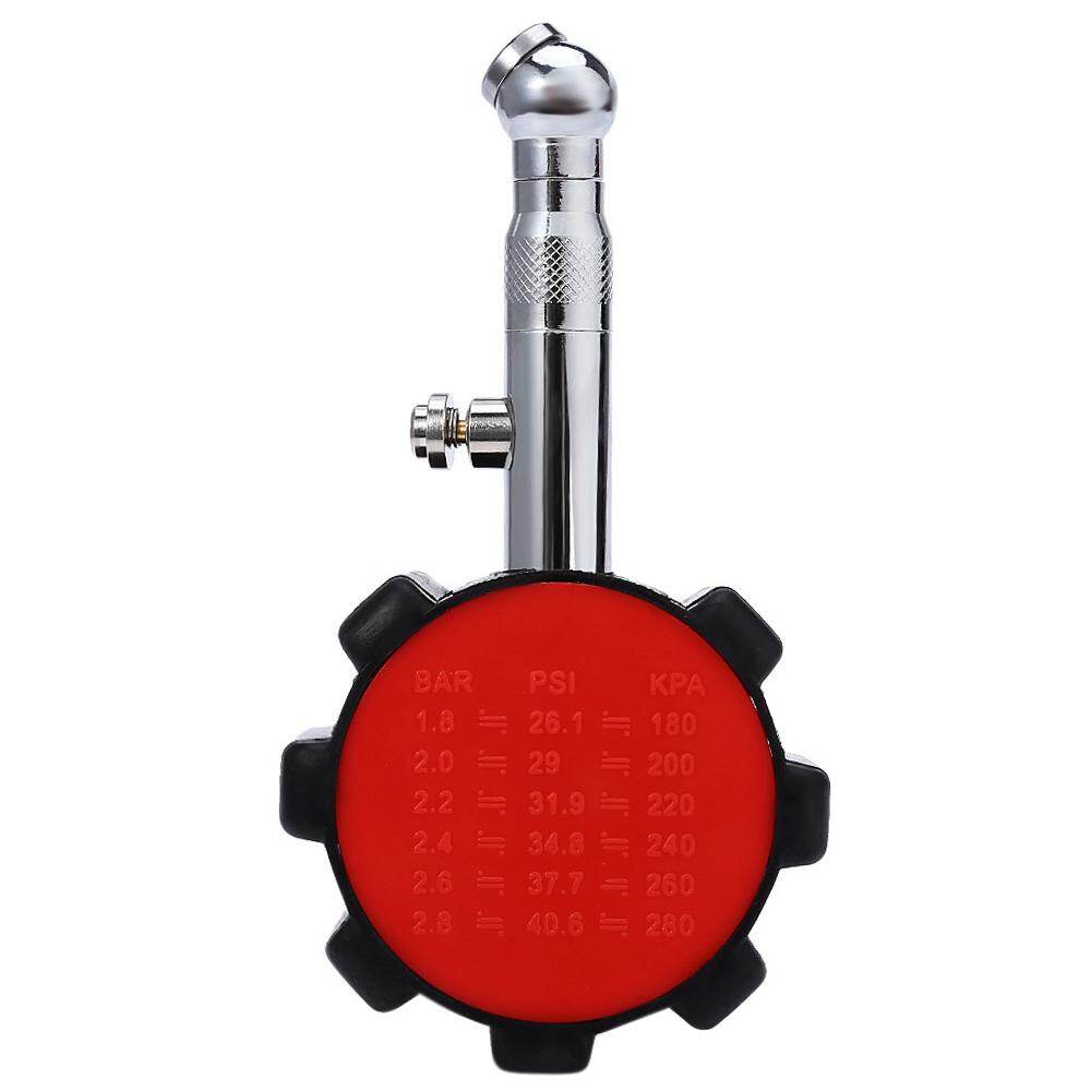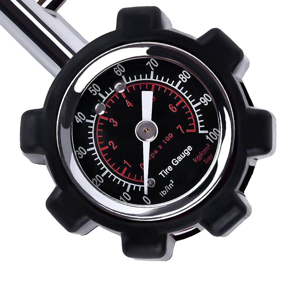 This 100PSI Tire Pressure is important for vehicle performance and gas mileage. Using tire gauge is the best way to dial in your tire pressure. It has a swivel angle chuck, air bleed button, rubber guard, 2 pressure units (psi amp; kg/cm), an easy face to read. The compact design makes it easy to store, carry and use.
