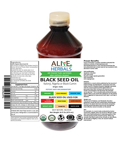 Alive Herbal Black Seed Oil Cold Pressed Organic - 100% Raw, First Pressing, Unfiltered, No Preservatives & Artificial Color- BPA Free Food Grade...