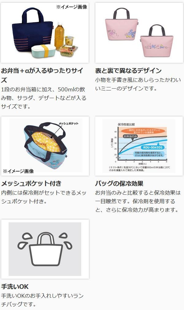 | 1段のお弁当箱に加え、500mlの飲み物、サラダ、デザートなどが入るサイズの保冷バッグです。内側には保冷剤がセットできるメッシュポケット付き。手洗いできるので、いつも清潔にお使いいただけます♪ |