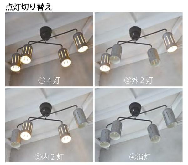 | 仕様 | 電球:E26/60Wまで(4個)※別売 取付方法:引掛けシーリング 点灯:リモコン(単4電池×2/テスト電池付属) 点灯パターン:全灯/外2灯/内2灯/消灯 ※調光器非対応 |