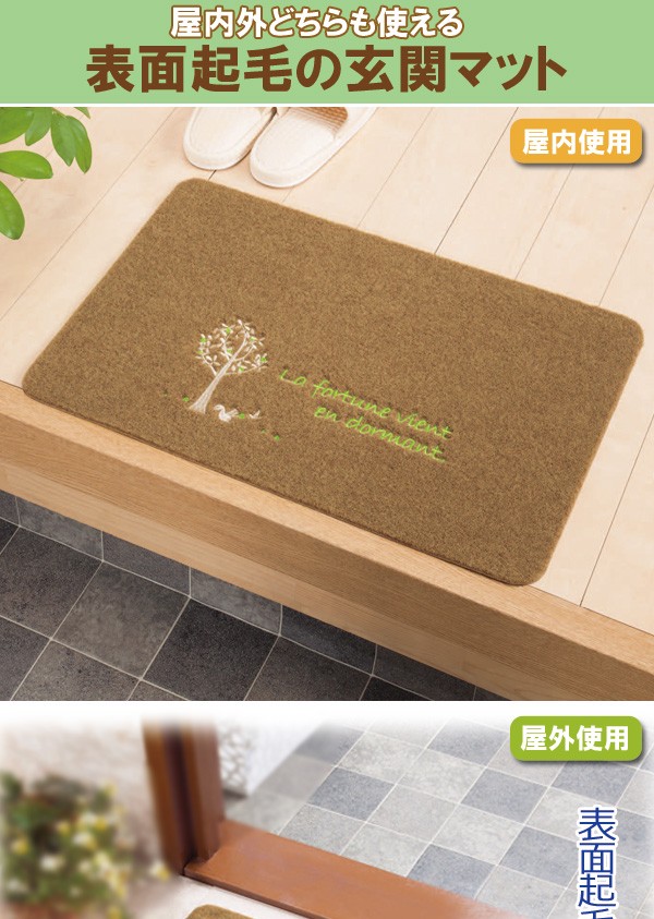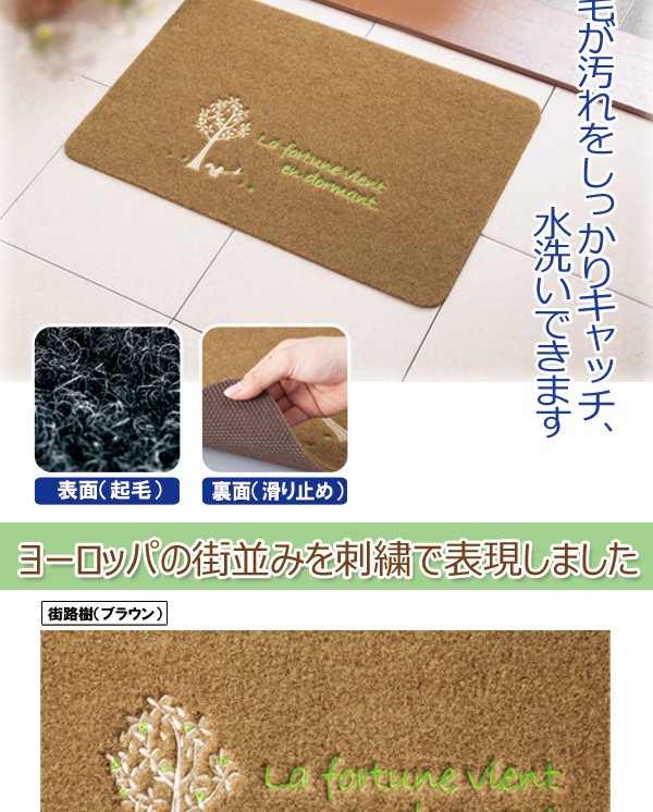 | 屋内外兼用で使用できる機能性マット。玄関マットはもちろん、泥落としマットとしてもおすすめ。足が喜ぶ、ふかふかの表面起毛素材を使用。裏面は柔らかいラバー素材で滑りにくい。ヨーロッパの街路樹をイメージしたデザインを刺繍で表現。幸運のモチーフのリンゴの木とリスがポイント。 |