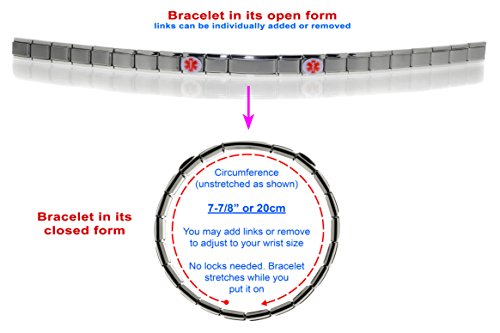 *** Sizes & Fitting *** Dolceoro "Medical" Bracelet comes with plenty of charms to cover wrist size up to 7-7/8", which is equal to 22 standard charm links. The most common width is 9mm for these Links (please refer to instruction picture on the listing). You can however add more links, or use your favorite charms from your current 9mm Italian charms bracelet. All 9mm Italian charm links have the same width and are interchangeable with each other.